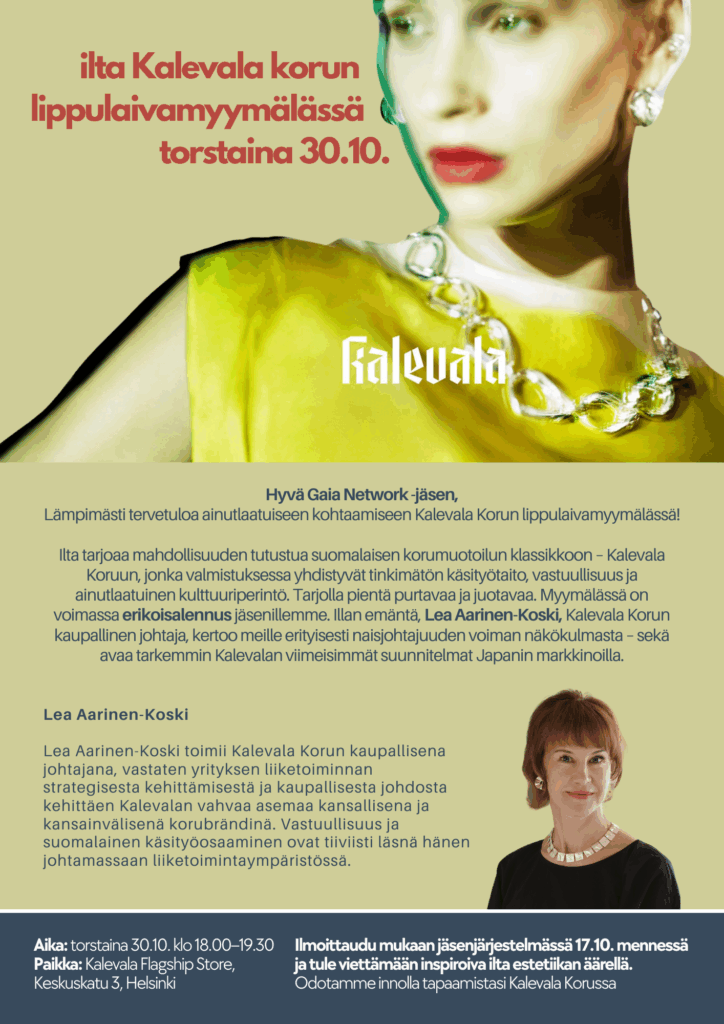 Ilta tarjoaa mahdollisuuden tutustua suomalaisen korumuotoilun klassikkoon – Kalevala Koruun, jonka valmistuksessa yhdistyvät tinkimätön käsityötaito, vastuullisuus ja ainutlaatuinen kulttuuriperintö. Tarjolla pientä purtavaa ja juotavaa. Myymälässä on voimassa erikoisalennus jäsenillemme. Illan emäntä, Lea Aarinen-Koski,Kalevala Korun kaupallinen johtaja, kertoo meille erityisesti naisjohtajuuden voiman näkökulmasta – sekä avaa tarkemmin Kalevalan viimeisimmät suunnitelmat Japanin markkinoilla.