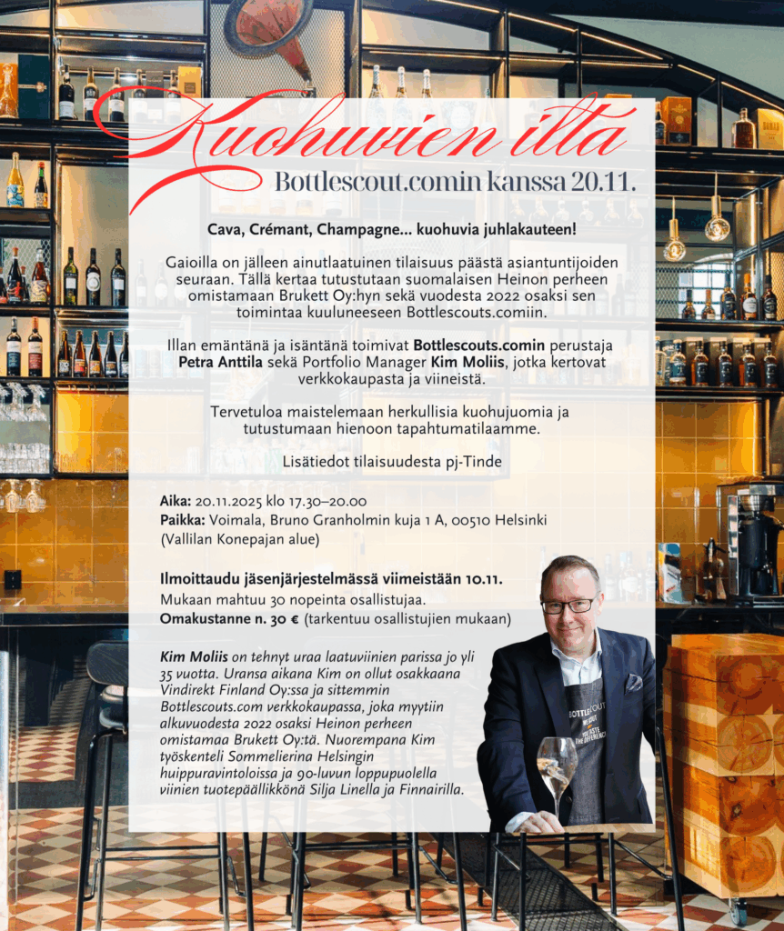 Illan emäntänä ja isäntänä toimivat Bottlescouts.comin perustaja Petra Anttila sekä Portfolio Manager Kim Moliis, jotka kertovat verkkokaupasta ja viineistä.