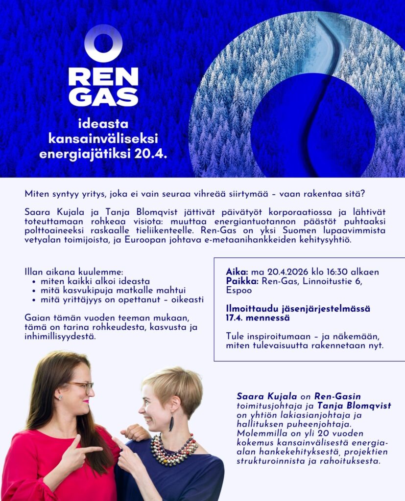 Saara Kujala ja Tanja Blomqvist jättivät päivätyöt korporaatiossa ja lähtivät toteuttamaan rohkeaa visiota: muuttaa energiantuotannon päästöt puhtaaksi polttoaineeksi raskaalle tieliikenteelle. Ren-Gas on yksi Suomen lupaavimmista vetyalan toimijoista, ja Euroopan johtava e-metaanihankkeiden kehitysyhtiö.