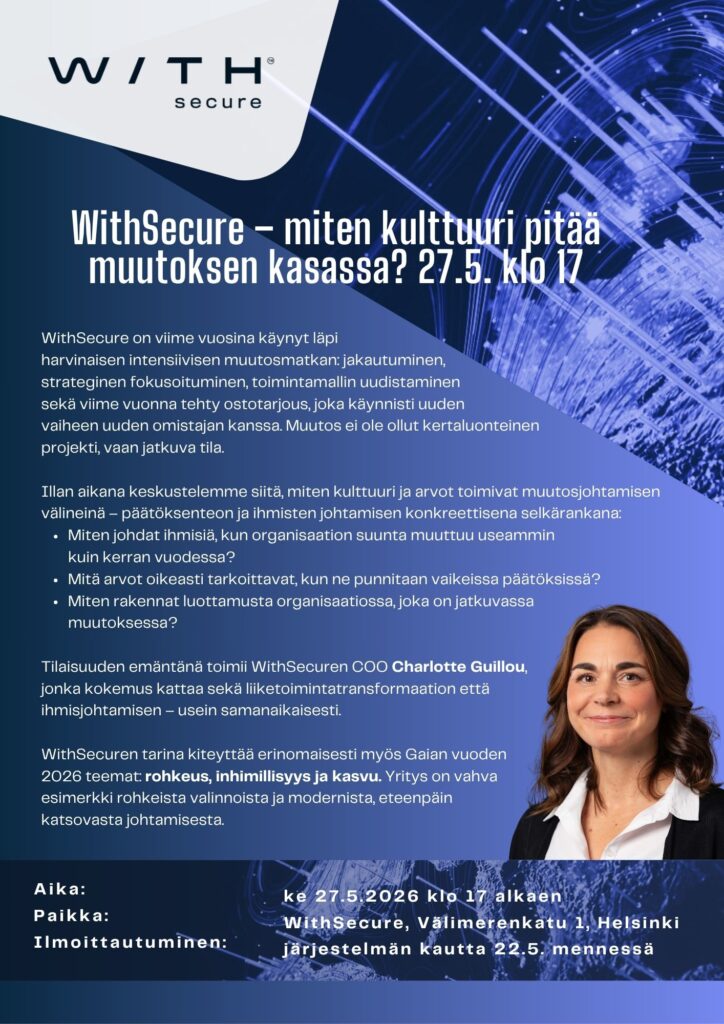 Tilaisuuden emäntänä toimii WithSecuren COO Charlotte Guillou, jonka kokemus kattaa sekä liiketoimintatransformaation että ihmisjohtamisen – usein samanaikaisesti.